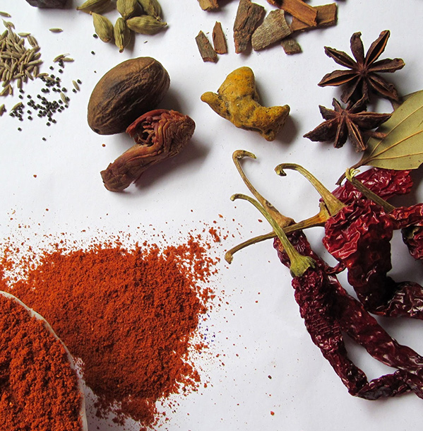 Many masalas have dried red chilies and other spices like coriander seeds, peppercorns, cumin, cardamom, ginger, garlic, etc. Some dishes also use kokum, dried kokam (amsul), tamarind, and raw mango (kairi).